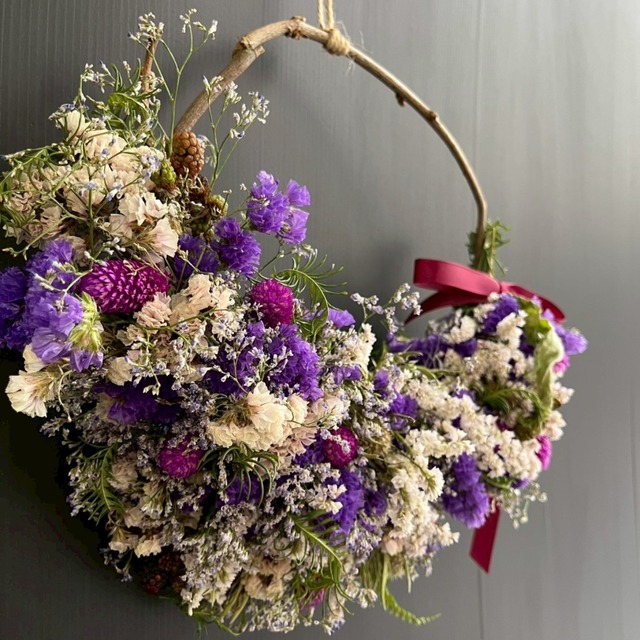 Size:H26cm × W30cm BOX Size:140 # ブラックベリーとスターチスのハーフリース 3種類のスターチスをふんだんに使用したハーフリースです。 ブラックベリーとピンクの千日紅を散りばめて、可愛らしい雰囲気に仕上げました。 ドライフラワーは、時間が経つにつれて落ち着いた色合いに変化していきます。水やりなどの手入れは不要で、手間なく花のある暮らしを楽しめます。 ※乾燥したお花は折れやすく大変デリケートになっておりますので、お取り扱いにはご注意ください。 【お届け先について】 配達区域に限りがございますので、ご注文前にご確認ください。 ■自社配達区域: 広島市中区、西区、東区、南区、安佐南区(沼田町伴を除く)、安佐北区(口田、落合のみ)、安芸区(船越町のみ)、安芸郡府中町へ配達させていただきます。 佐伯区につきましては、ご注文前にcontactからご相談ください。 広島市の花屋「あんどう花店」より、心を込めてお届けします。 ■自社配達区域外の地域: ヤマト運輸に委託し、中国、四国、近畿、九州地方のヤマト運輸が翌日配達が可能な地域のみお届けさせていただきます。 【お届け日について】 最短で4日後からお届け希望日を選択いただけます。 お届け先や商品によって、最短到着日に数日追加される場合があります。