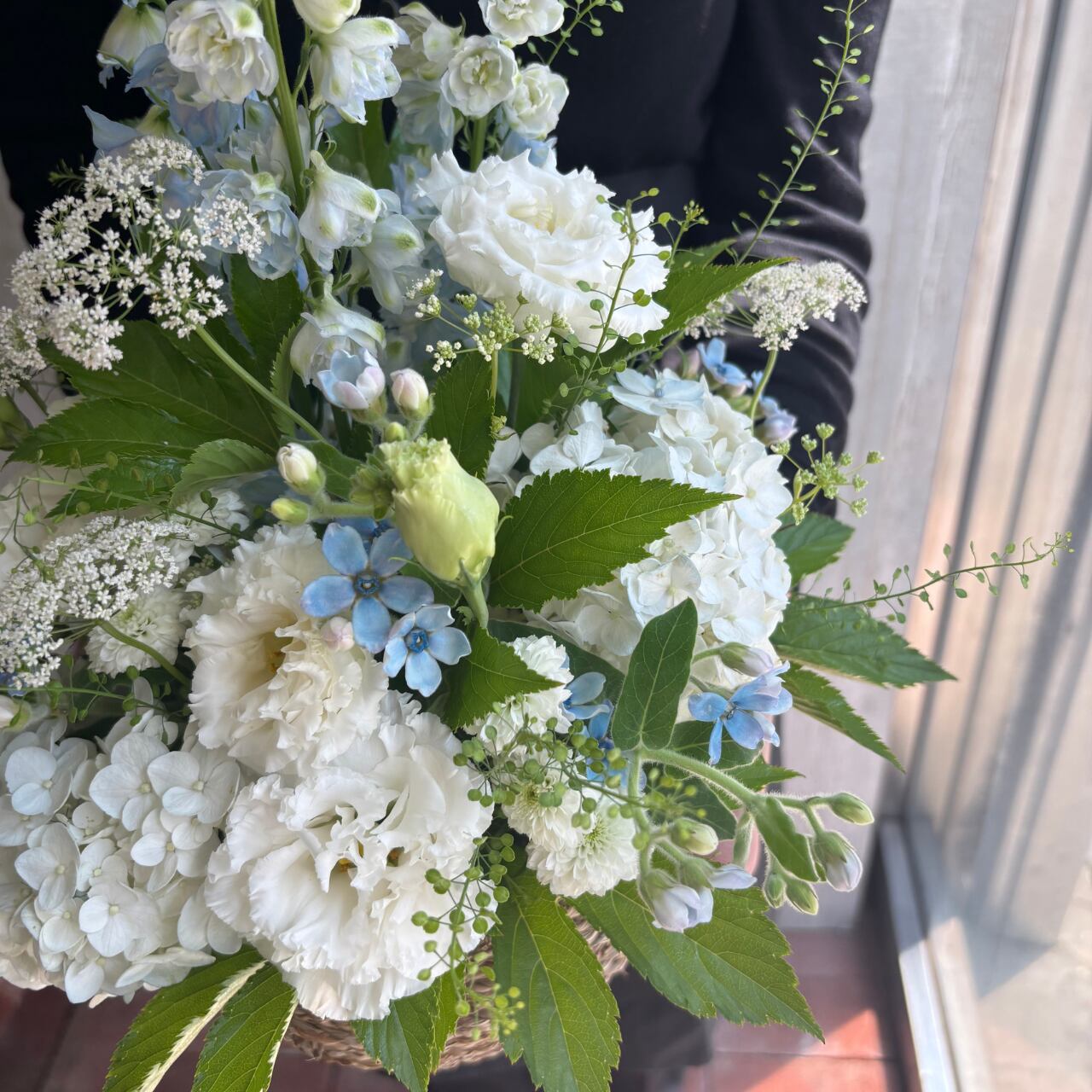 清らかで上品な白を基調に、心落ち着くグリーンの葉物や淡い色のお花を添えてお作りします。