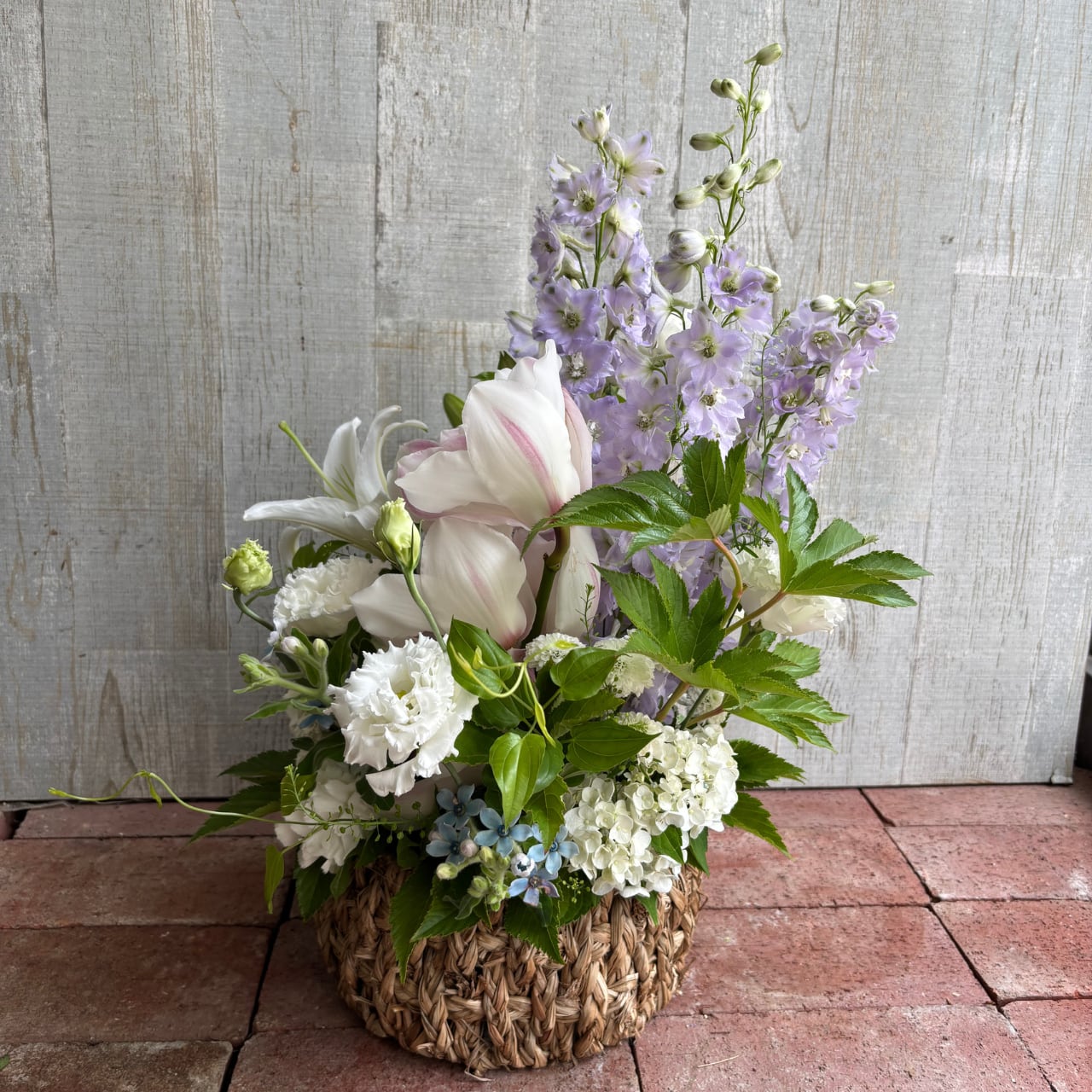 ※写真はイメージです。直近の花市で仕入れた新鮮なお花を使ってお作りいたしますので、季節によって使用する花材が変更になる可能性がございます。掲載写真にできる限り雰囲気をあわせてご用意いたしますので、ご了承ください。