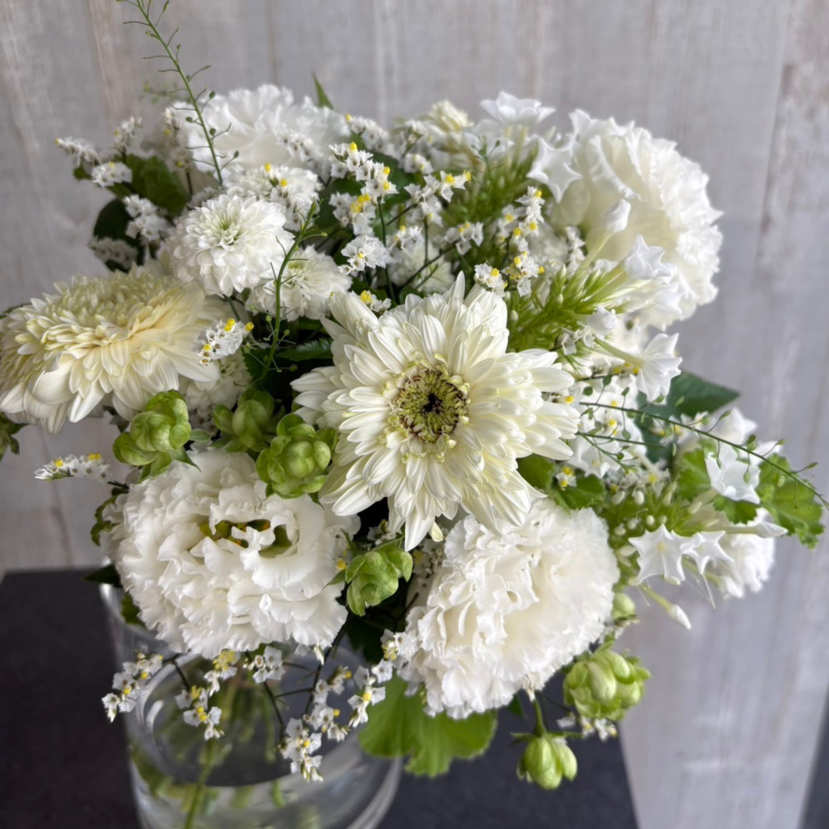 白のお花をメインに、小花やグリーンをたっぷりあしらって、爽やかな雰囲気に仕上げました。