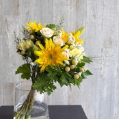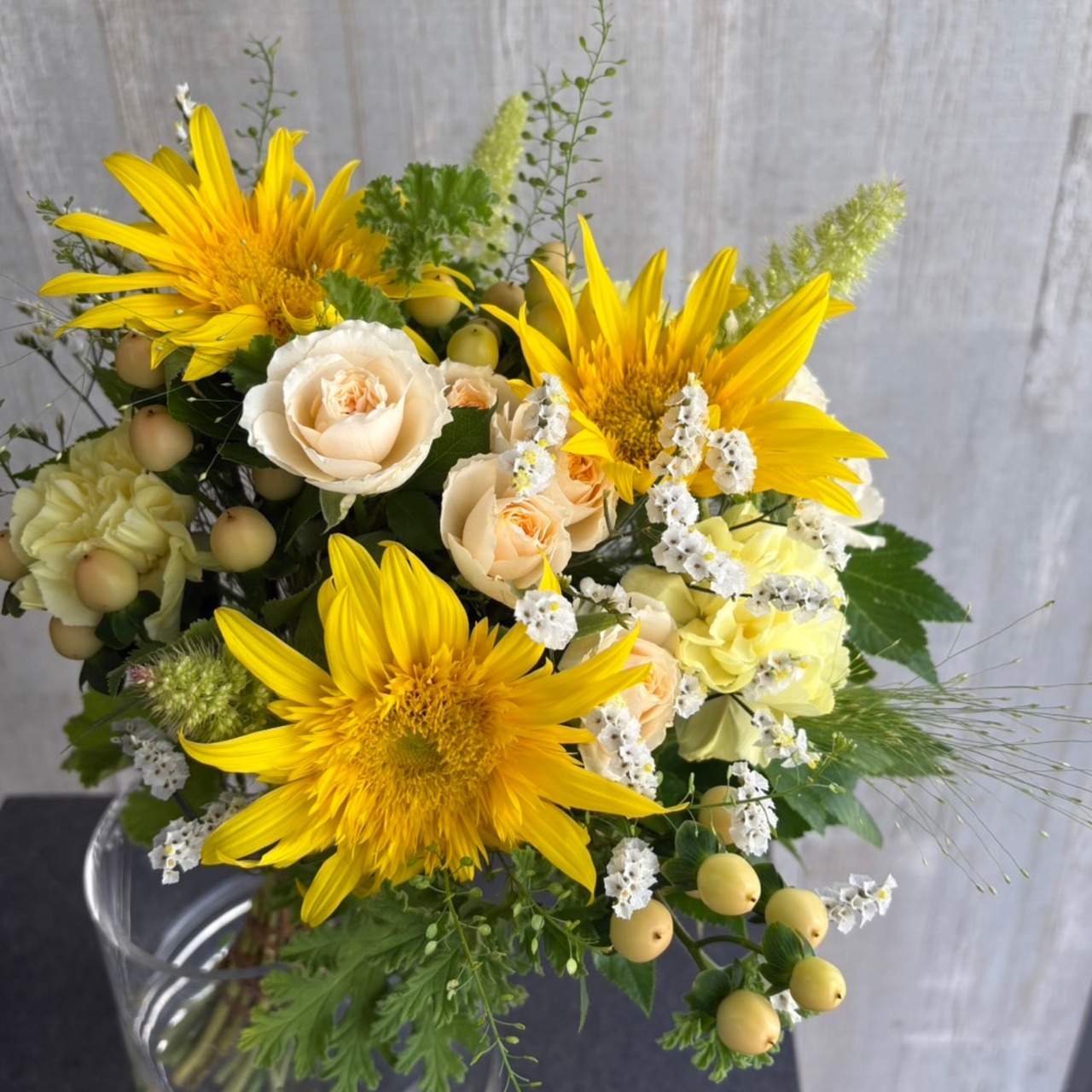 太陽のような明るいひまわりをたっぷり使い、見ているだけで元気になれるブーケに仕上げました。