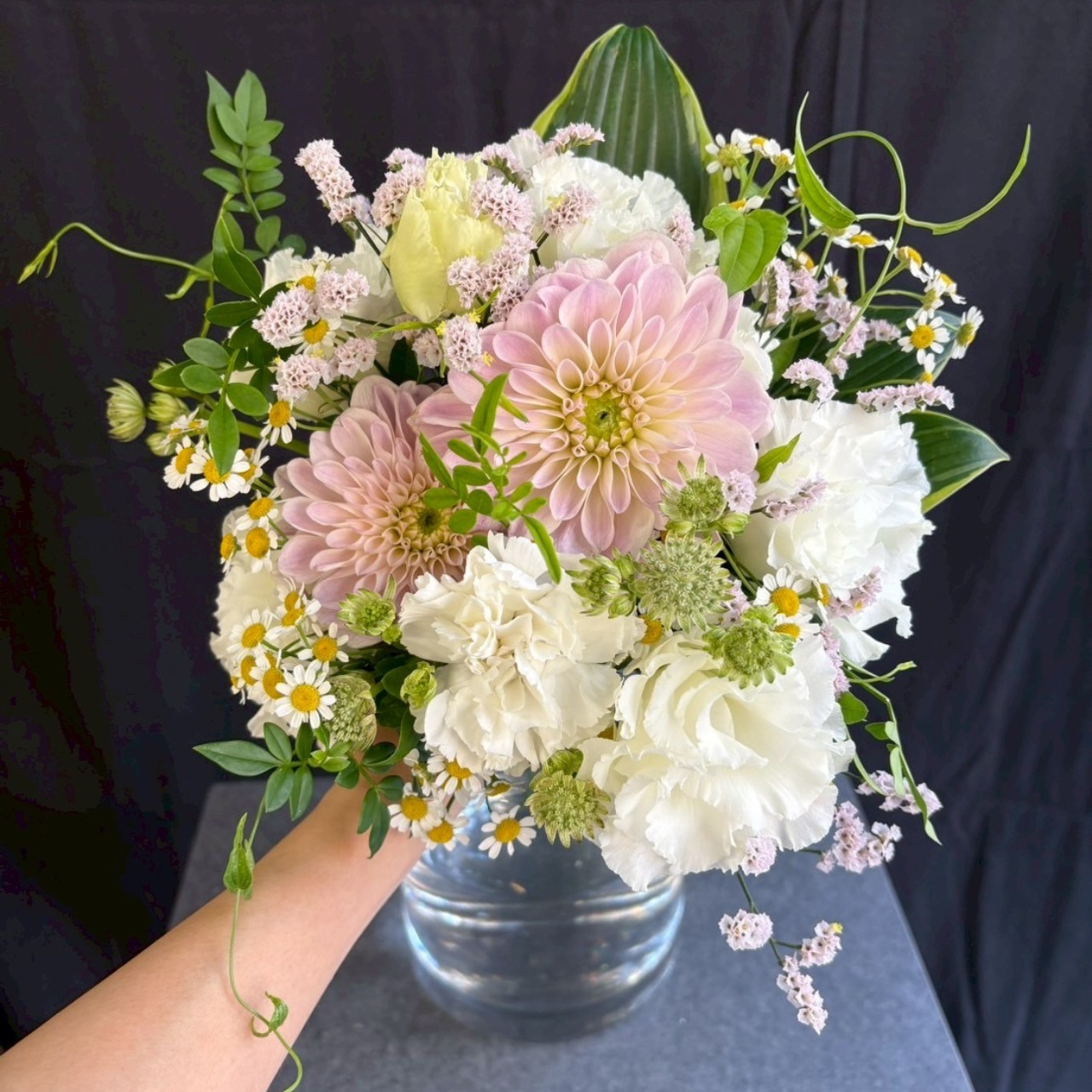 ※写真はイメージです。直近の花市で仕入れた新鮮なお花を使ってお作りいたしますので、季節によって使用する花材が変更になる可能性がございます。掲載写真にできる限り雰囲気をあわせてご用意いたしますので、ご了承ください。