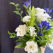 # お供え用フラワーアレンジメント 三方見 ホワイト&ブルー