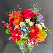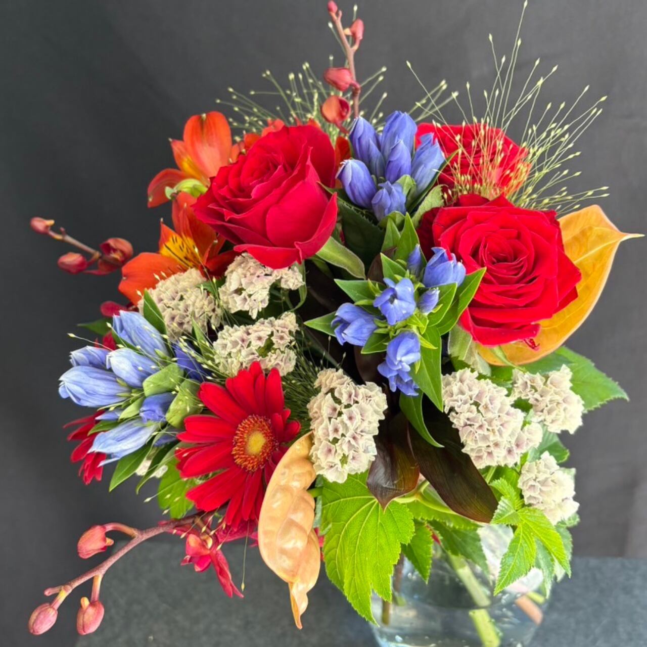 秋色であるレッドやオレンジのお花を詰め込んで、一つひとつ心を込めてお作りいたします。