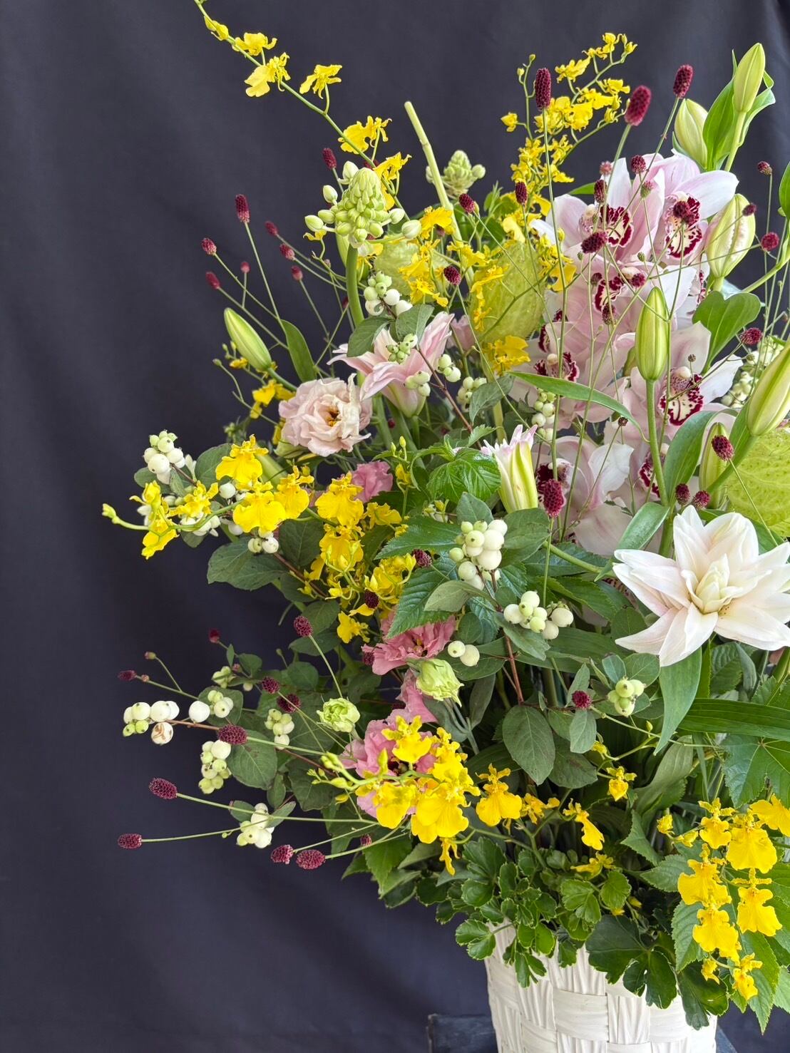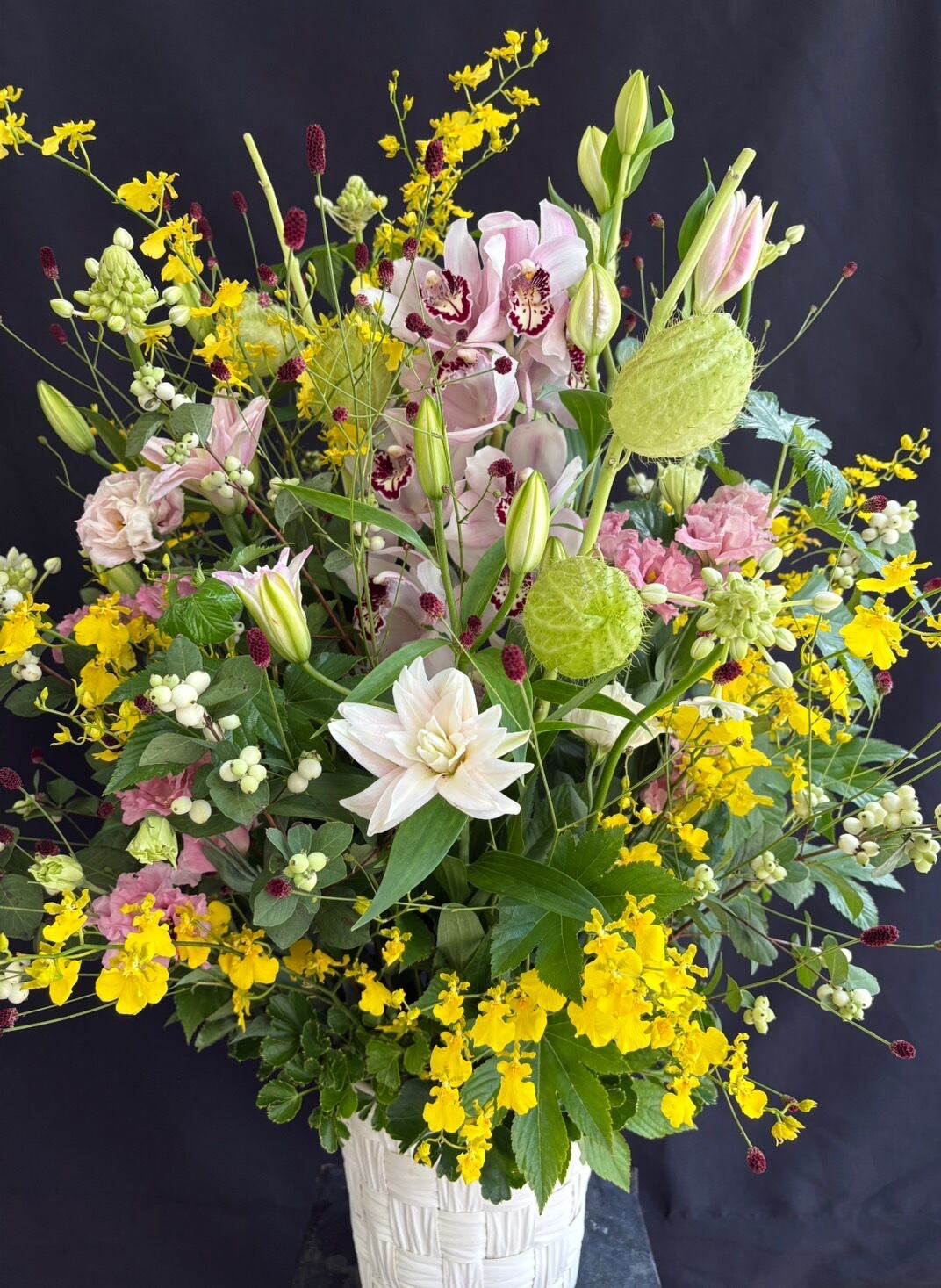 ※写真はイメージです。直近の花市で仕入れた新鮮なお花を使ってお作りいたしますので、季節によって使用する花材が変更になる可能性がございます。できる限り掲載写真に雰囲気をあわせてご用意いたしますので、ご了承ください。