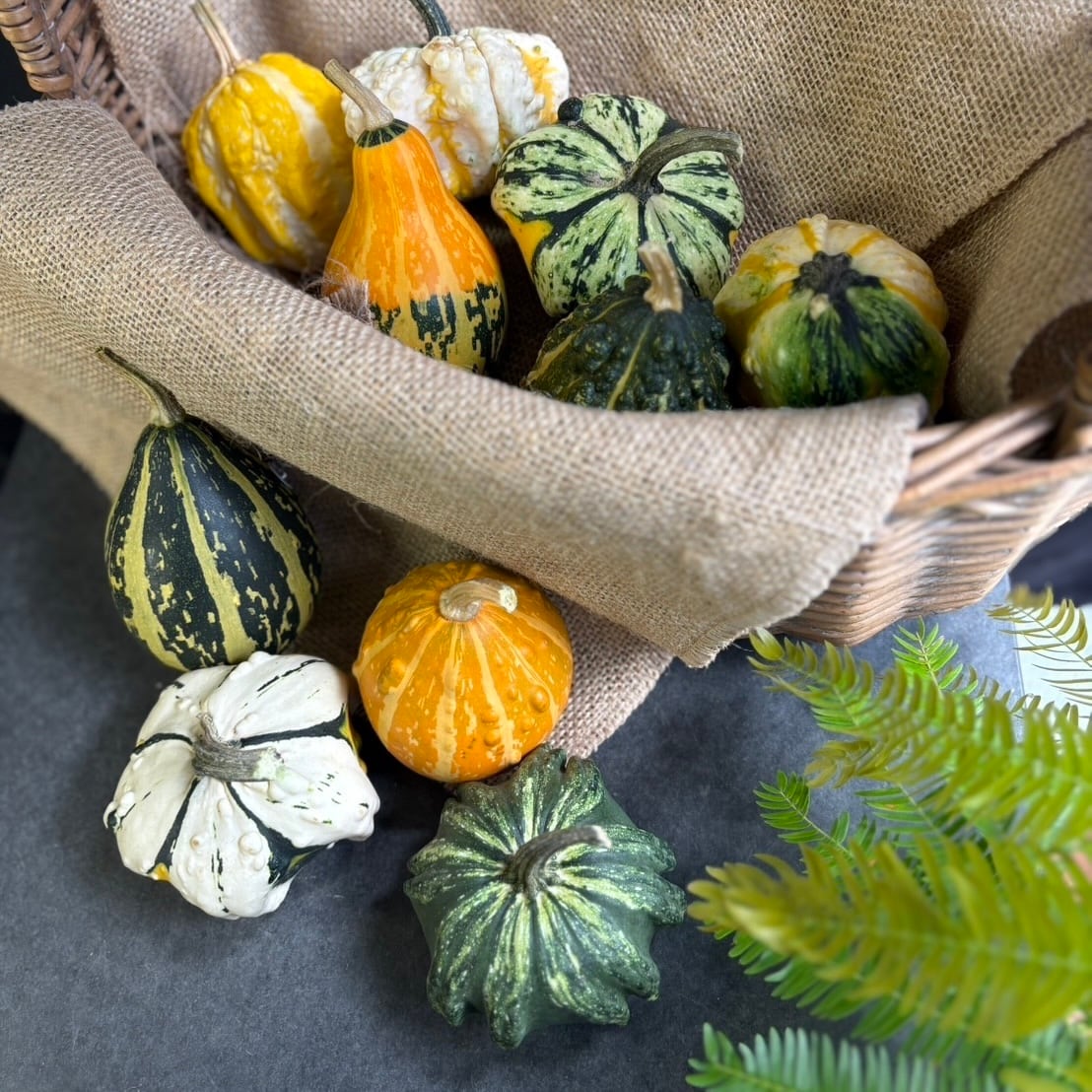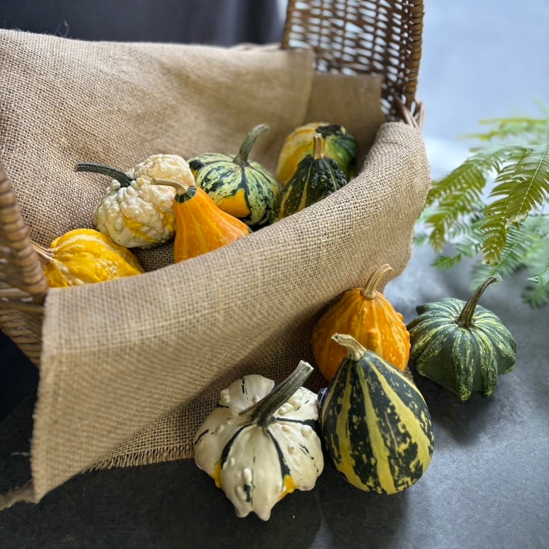 テーブルや棚、窓辺をちょこんと飾るだけで、一気にハロウィンムードを高めてくれるかぼちゃのセットです。手のひらサイズの可愛らしいかぼちゃが、10個アソートで届きます。