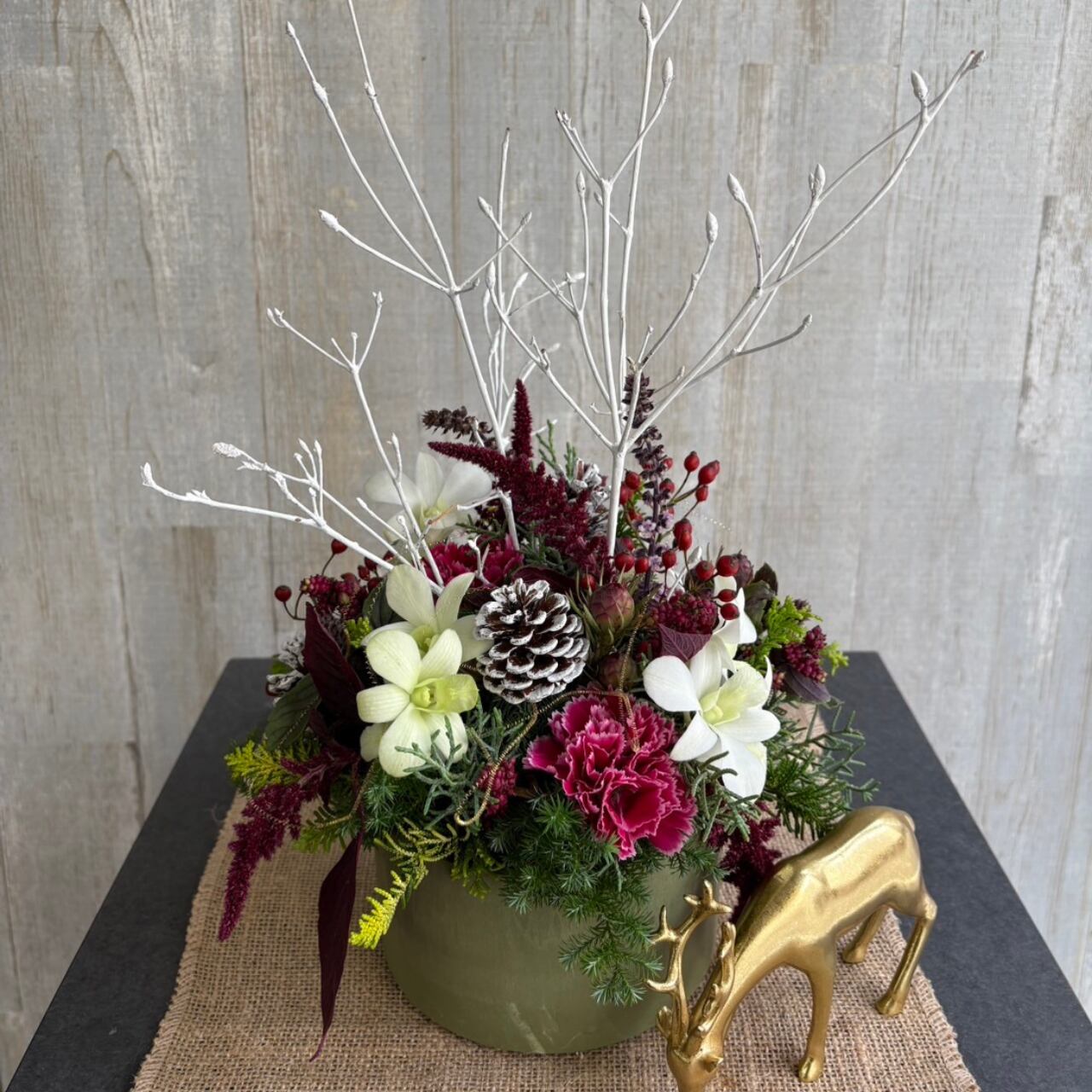 針葉樹や実物をたっぷりあしらったウィンターシーズンならではのアレンジメントです。