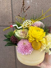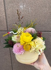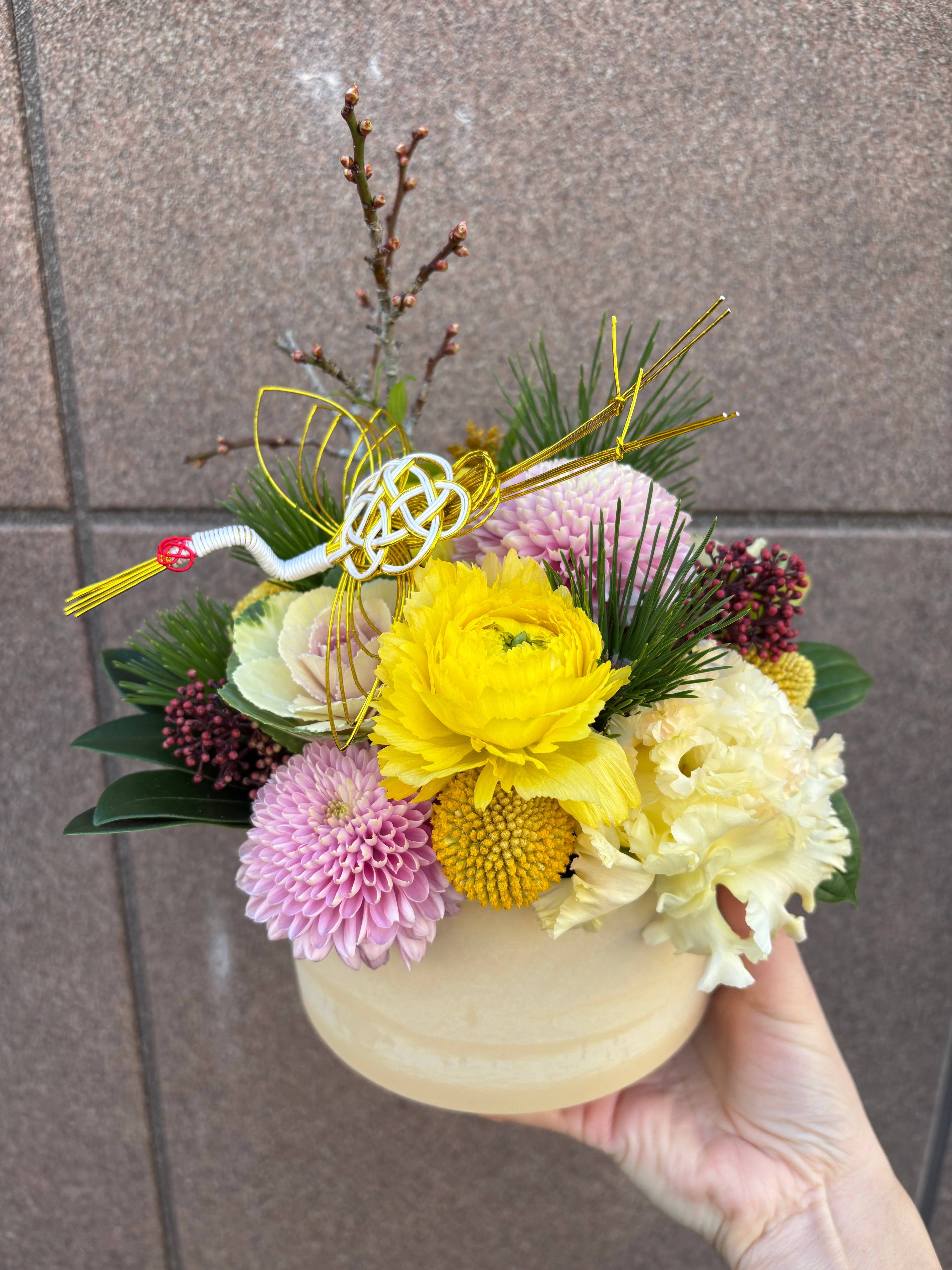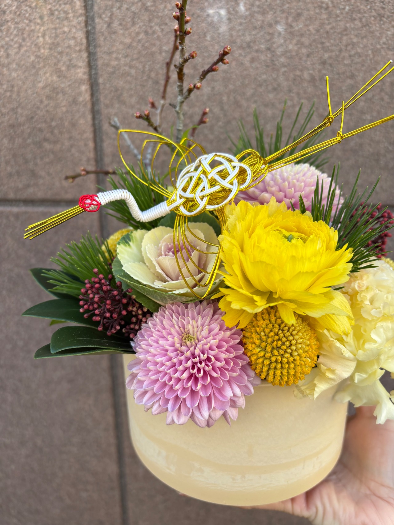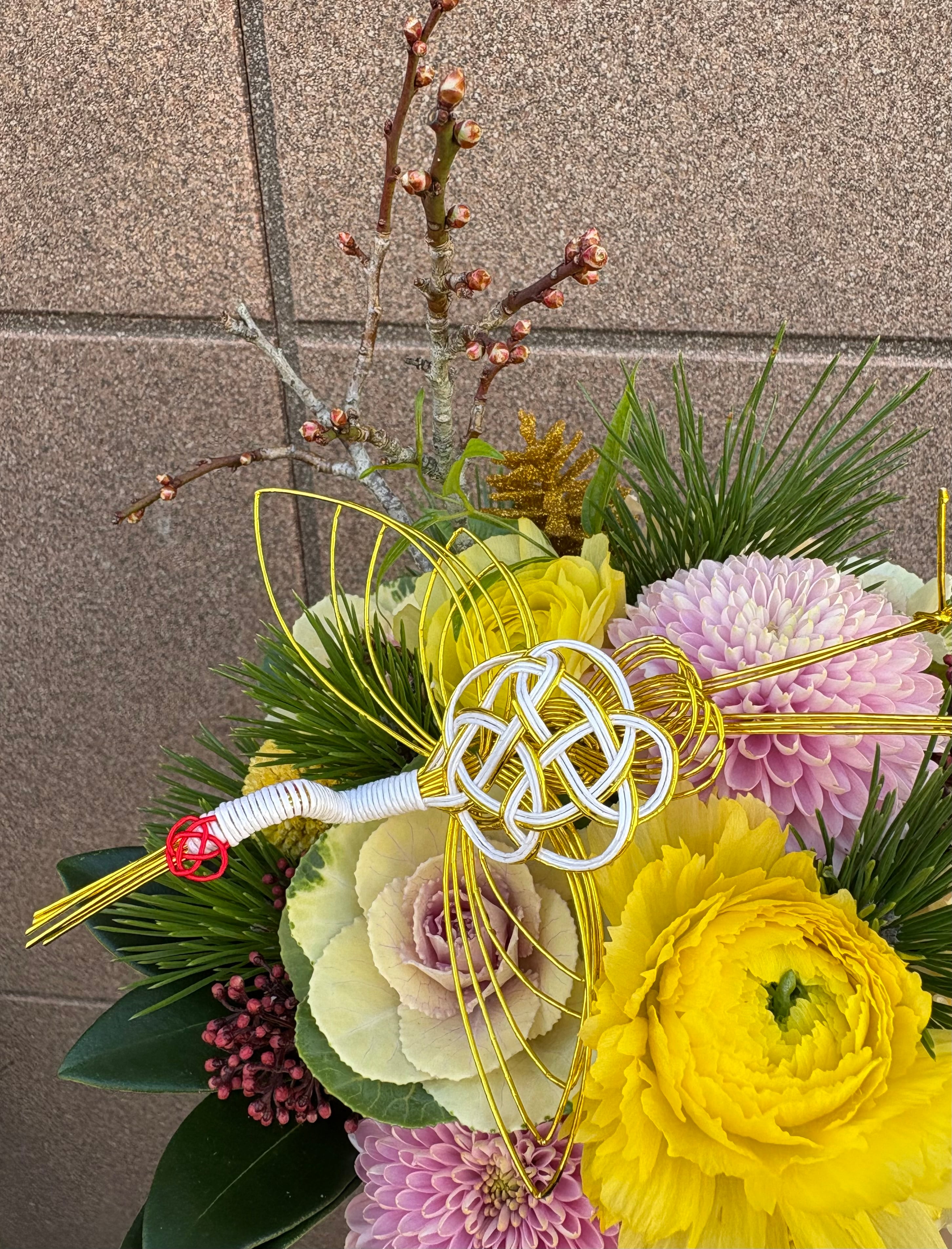 お正月を華やかに彩る福を連れてくる鶴を水引で表現したおめでたいアレンジメントです。新年の訪れを祝うにふさわしく、鶴の形をした水引が特別な意味を添えています。家庭ではもちろん、贈り物としても喜ばれるアイテムです。伝統とモダンが融合したデザインで、心温まるお正月を演出します。